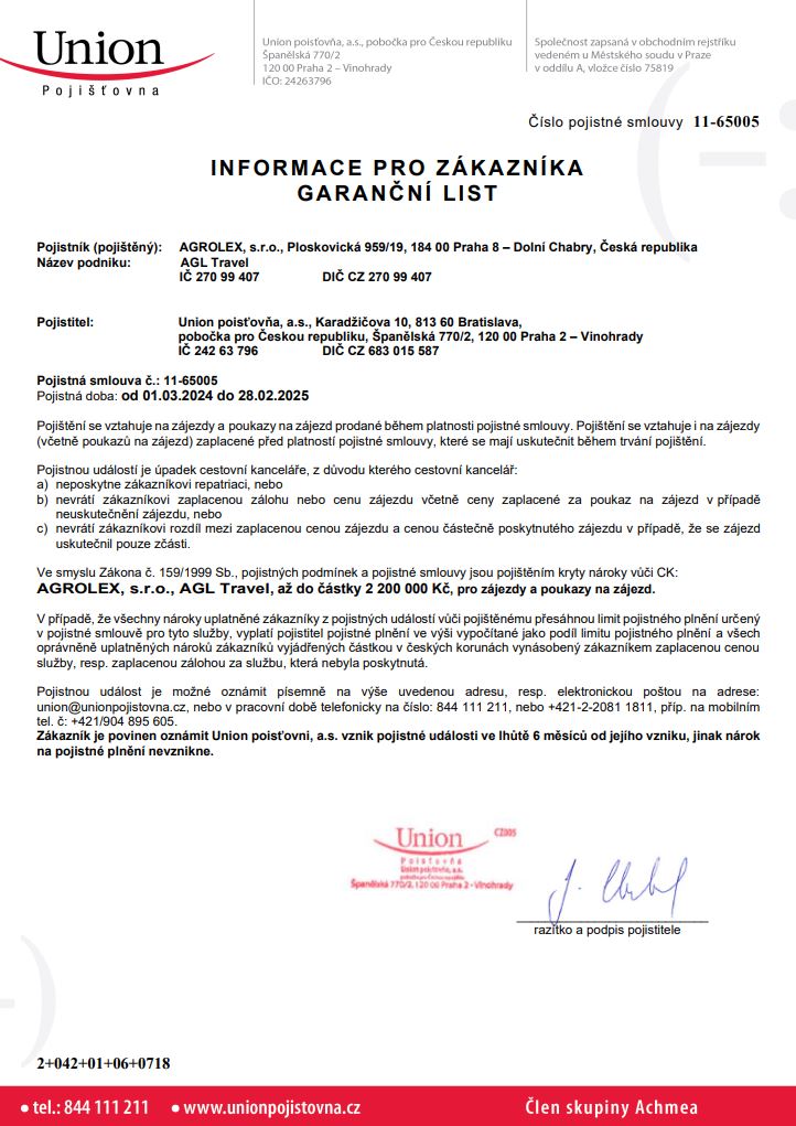Cestovní kancelář AGL travel (jako AGROLEX, s.r.o.) je pojištěna proti úpadku u UNION pojišťovny