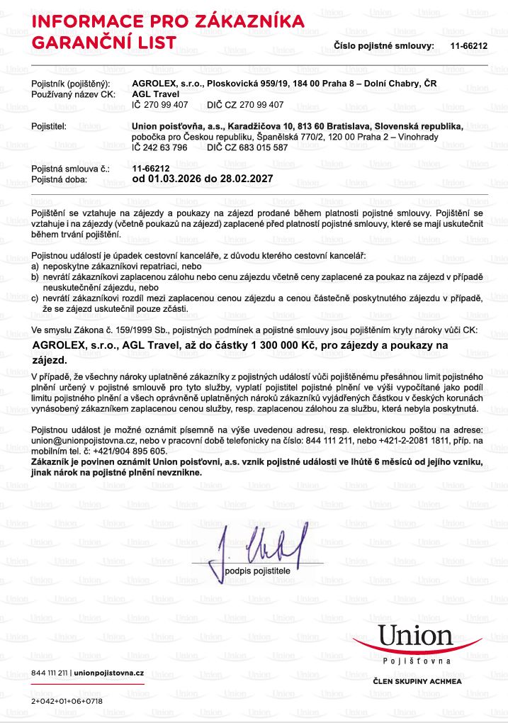 Cestovní kancelář AGL travel (jako AGROLEX, s.r.o.) je pojištěna proti úpadku u UNION pojišťovny